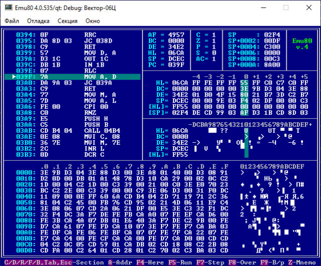 | Emu80 QT – наиболее точный эмулятор, отладку следует вести именно в нём. Обладает лучшим для Вектора отладчиком. Позволяет гибко менять частоту процессора, а не выбирать из фиксированных значений, как VV. Запись экрана этого эмулятора через OBS не работает. | ![]() |