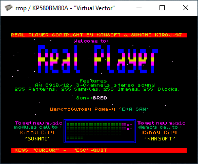 Для работы потребуются все три:| Virtual Vector (VV) – самый интуитивно-понятный эмулятор. Поддерживает большинство форматов и четыре процессора платформы (8080A, 8085A, КР580ВМ1, Z80), между которыми можно переключаться в один клик и менять им частоту. Удобен для записи экрана через OBS. Имеет примитивные отладчик и профайлер. | ![]() |